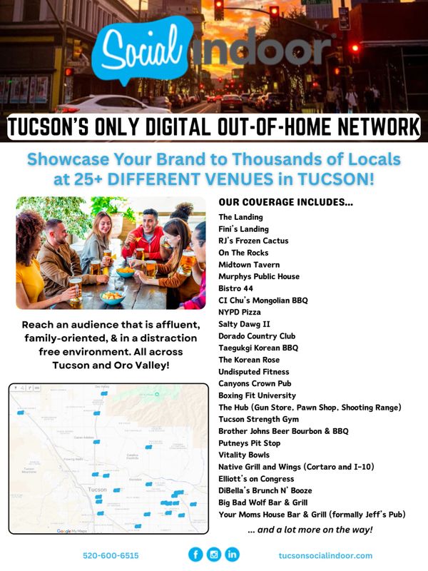 At Tucson Social Indoor, we started as a small business just like you. We understand the challenges of running a small business and we are passionate about helping others succeed. That's why we started this company, to help other small businesses thrive. For over thirty years, our team has been providing a captive audience through indoor advertising, reaching and impacting consumers. Our digital boards are strategically placed in high visibility, distraction-free areas. Creating awareness, and weaving messages for your brand in a natural and memorable way. Digital Indoor Advertising is an imperative complement to your marketing strategy. What audience can we help your business reach today?